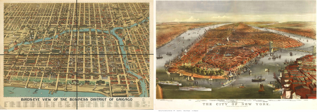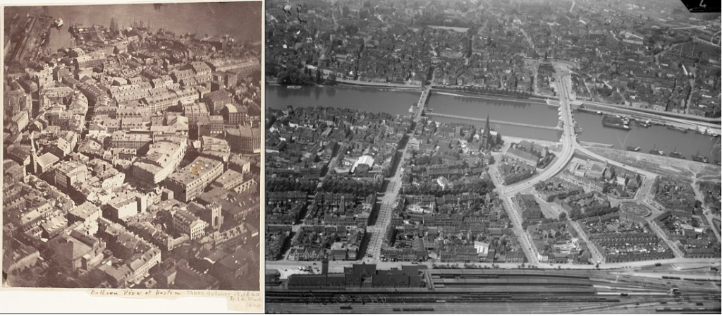 From about 1850, however, we have large numbers of photographs, which again show few ugly buildings. It may be objected that there will be biases in the buildings that were chosen to be photographed. This is no doubt true, but much less so of aerial photography, beginning with this photo of Boston. We have a lot of evidence of this kind: 95,000 photographs of early-twentieth-century Britain are available here, covering much of urban Britain at the time, and many such photographs were of course also taken in other affluent countries. Again, we do not find the predicted swathes of lost ugly buildings.