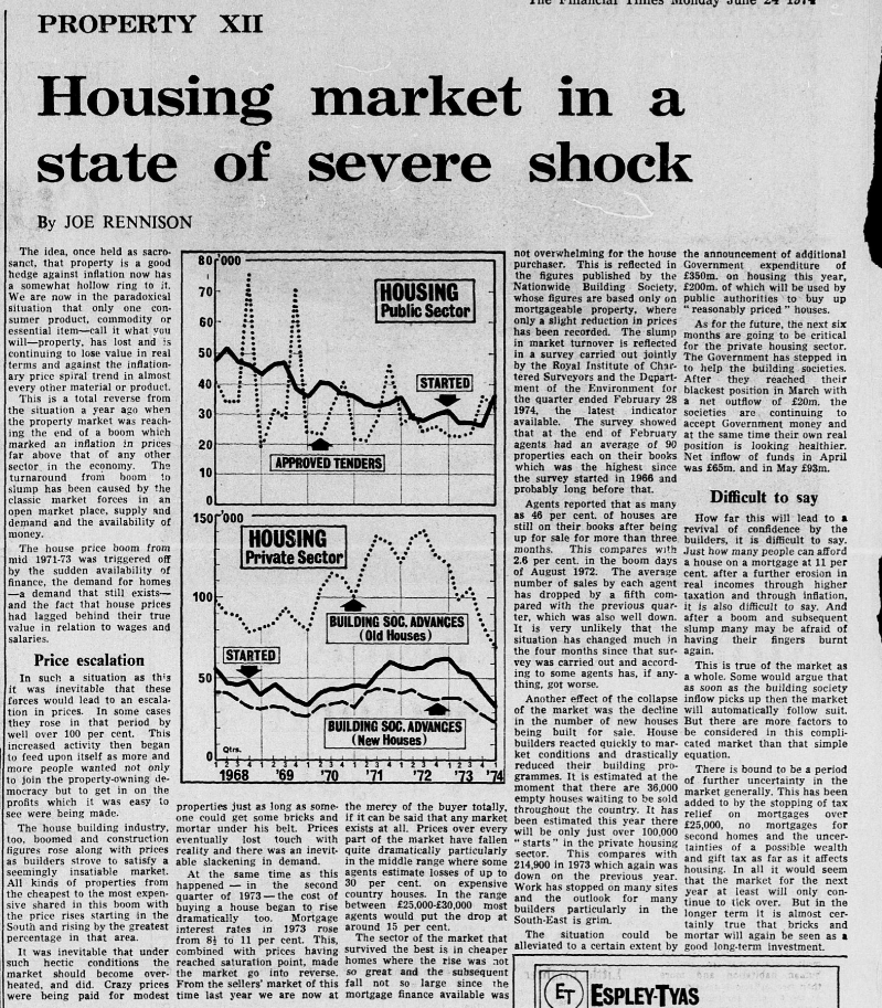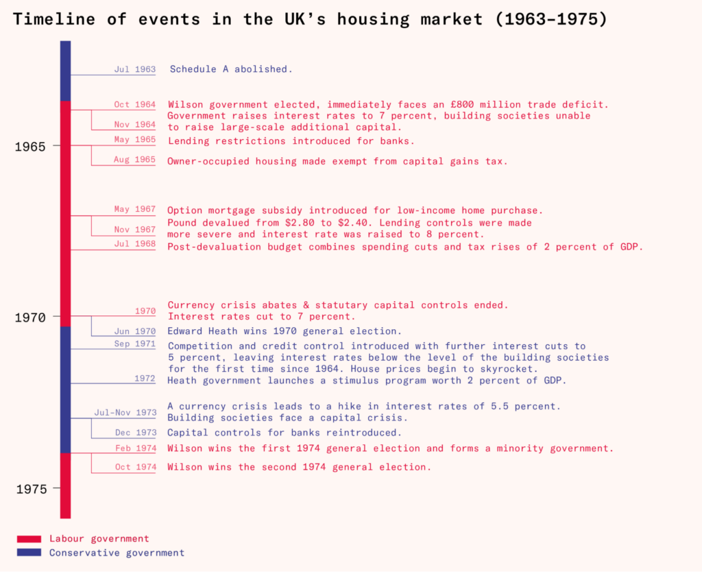 Facing a severe trade and current account deficit under fixed exchange rates, Harold Wilson’s Labour government cut spending, raised taxes, and dramatically hiked interest rates to defend the pound. The high market interest rates began to dry up funds for mortgages, creating a de facto ‘definancializion’ of the housing market.