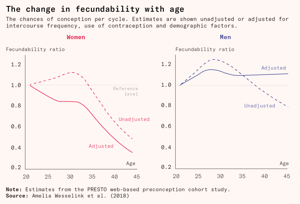The chance of conceiving a baby naturally with regular sex drops from 25 percent per month in one’s twenties to about five percent per month at 40, while the chance of miscarrying rises from about eight percent for women under 30 to around one in three for 40-year-olds. Around a quarter of women will experience difficulty becoming pregnant in their late thirties, and it’s not yet possible to predict who. And virtually all women become infertile during their forties. This means that women who want biological children often need to plan to have children earlier in life, whether or not it suits their professional desires.
