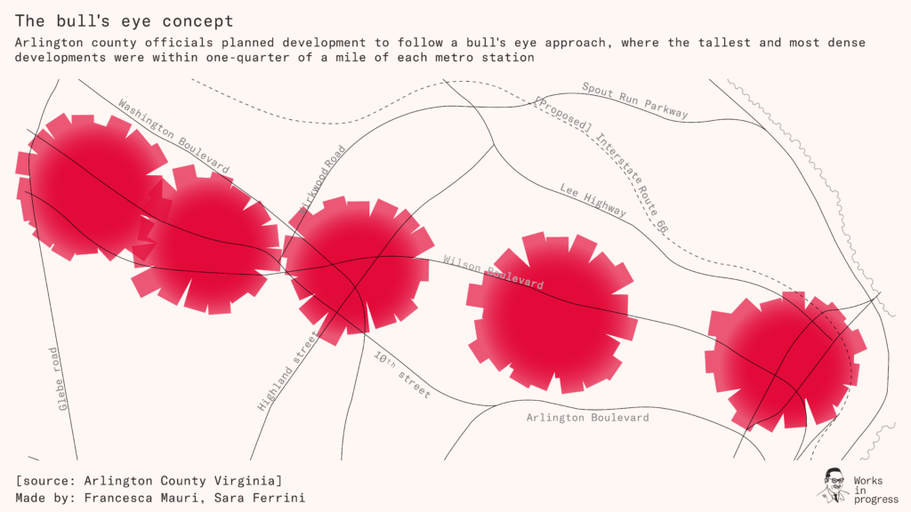 Planners engaged residents and developed a ‘bull’s eye’ plan for permitting dense development around these five stations, illustrated below. The quarter mile of land closest to the stations was intended for the most density. Today, several buildings stretching over 20 stories stand within these narrow radiuses. The exact density permitted in the county’s transit corridors isn’t spelled out in its zoning ordinance because projects may purchase transferable development rights from nearby property owners or earn bonus density for providing income-restricted housing or other benefits that lead the County Board to approve greater density than is permitted by-right.