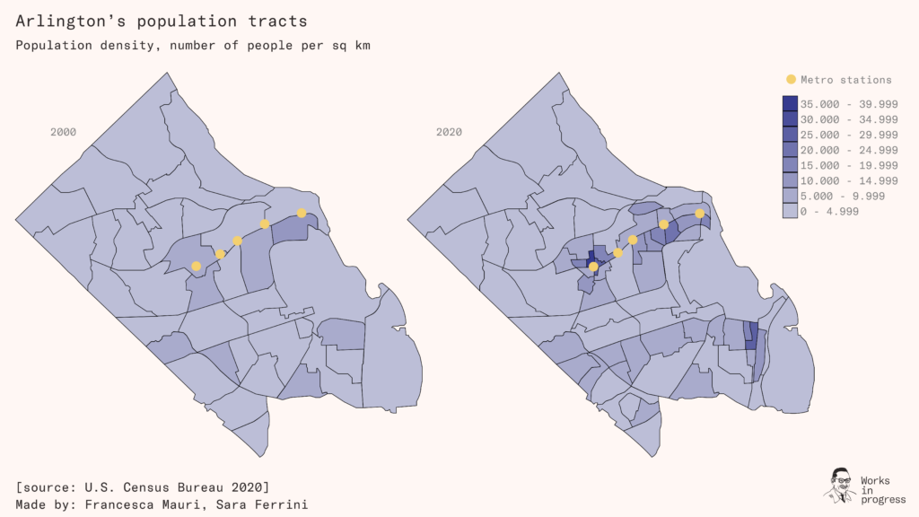 In the decades since, the county has implemented new ‘sector plans’ continuing to create more opportunities for development around these five stations as well as around two stations on Metro’s Blue Line and along an east-west bus corridor in South Arlington. The maps below show the most recent 20 years of redevelopment and increasing population density that this history of planning for apartments has facilitated.