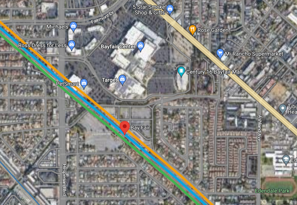 Arlington’s approach is quite different from most of the rest of the country. To take one example, zoning around the Bayfair station on Bay Area Rapid Transit in San Leandro, California has locked in low-density commercial and residential development as shown below.