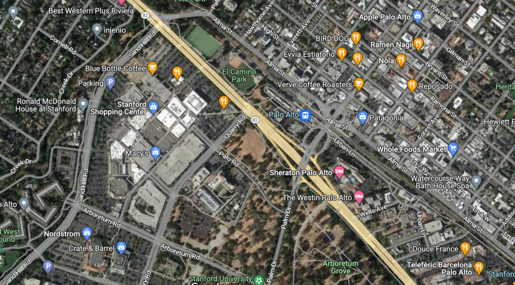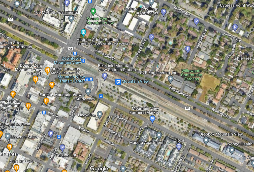 Here, the Irvington station on the New York region’s Metro-North is adjacent to low-value commercial development. Below, similar development patterns are seen at 1) the Ossining station on Metro-North, 2) the Palo Alto station on Caltrain, and 3) the Mountain View station on Caltrain. These contrast with the Arlington approach of permitting dense, mixed-use development near transit stops.