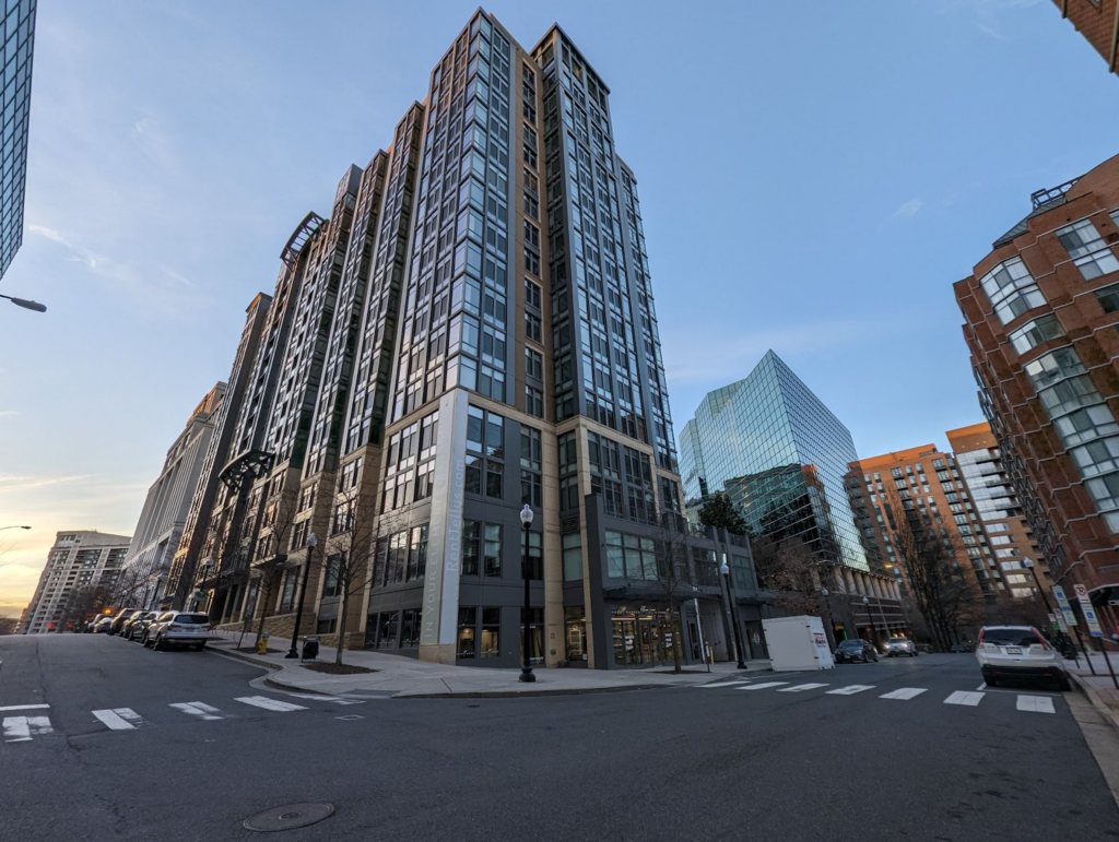 Today, much of Orange Line Arlington is surrounded with high-rise residential and office towers, but this transformation took time to emerge. In 1980, a Washington Post article bemoaned the difficulty of redevelopment in Clarendon, ‘a patchwork quilt’ of small parcels, many of them with long commercial leases. By the end of that decade, a large office building would flank the south side of the Metro station. Then, finally, in 2010, the entire block east of the Metro would be redeveloped with an award-winning Art Deco-influenced office, residential, and retail project. As shown below, the building incorporates a two-story original Art Deco building.