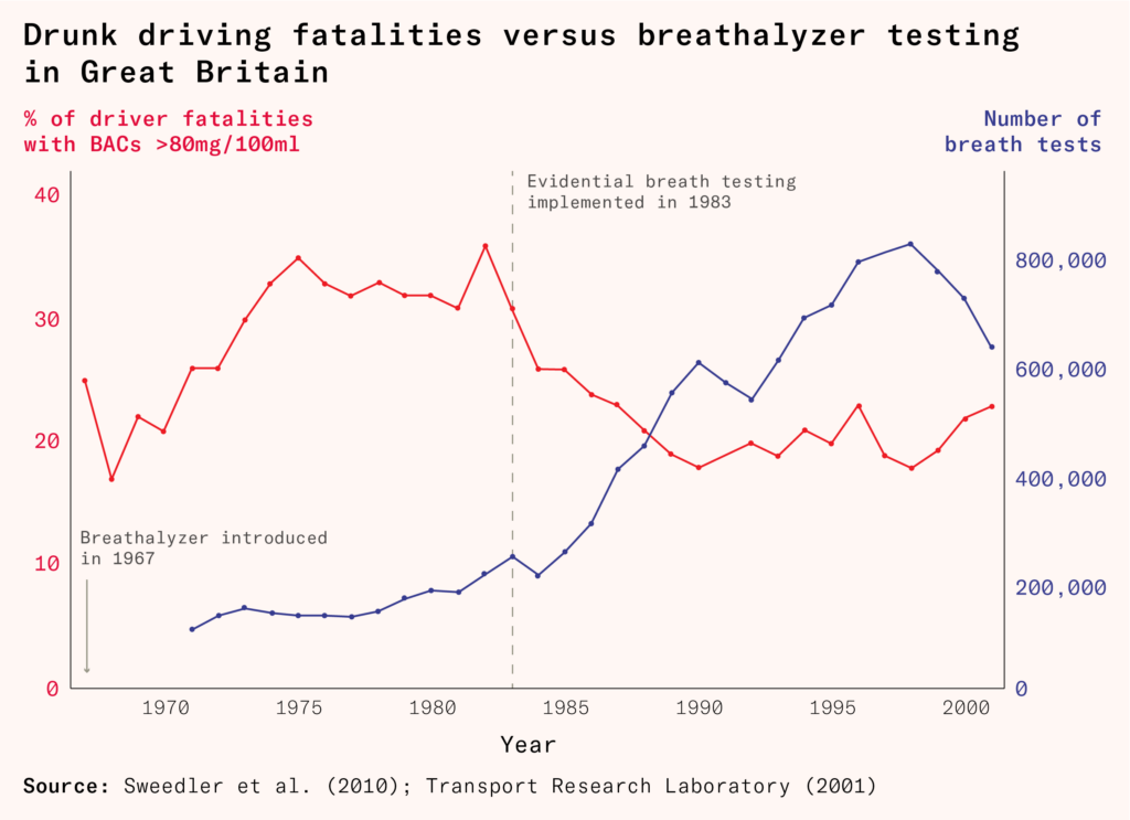 We know that fatalities from drunk driving dropped during the period that breathalyzer testing ramped up and sanctions increased. But was this causation or coincidence?