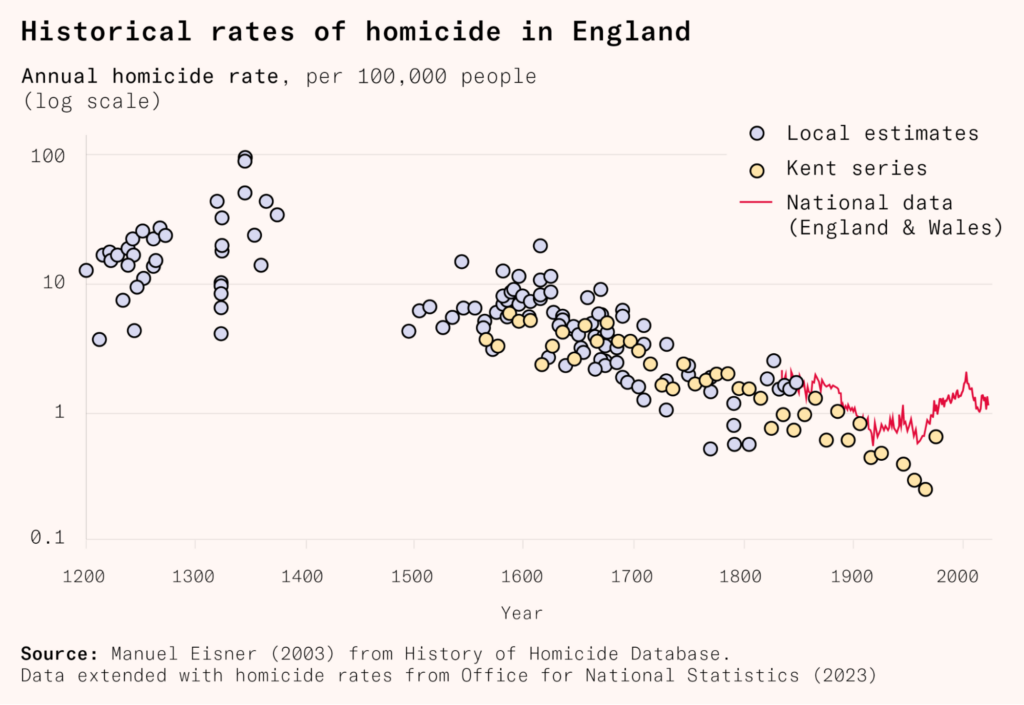 Remarkably, even murder may be like this. According to the best available evidence, homicide rates were 50 or 100 times higher in the 1300s, across Europe, than they are today. It was simply considered normal – even admirable – to prosecute feuds and escalate drunken fights over honor into potential killings. These norms steadily changed, in substantial part because governments gained the capacity and desire to punish perpetrators. Blood feuds and brawls turned into ritualized duels, and eventually self-control became normal and impulsiveness deviant. It is widely argued that the honor culture of the US South helps to explain why murder rates are higher there today.