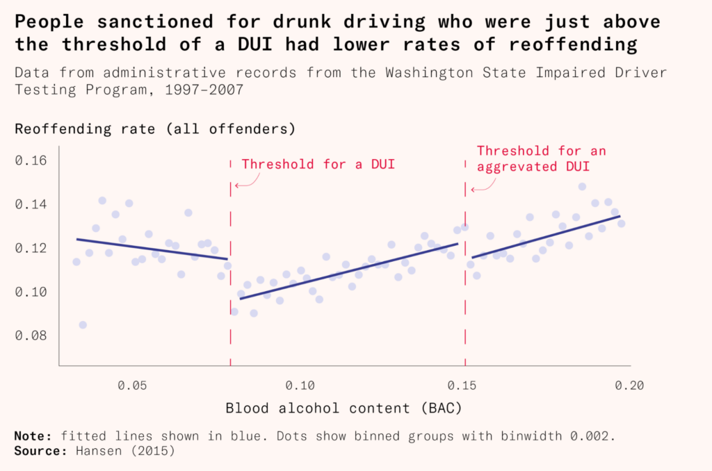 Under this sanction regime, if you are caught with a blood alcohol concentration just above a threshold, you will be punished much more harshly than someone who was caught driving just under a threshold. Since you can’t target an exact percentage point of alcohol in the blood, those who were measured at .08 would be similar to those with a .079 level, except for the fact that they would be punished. It turned out those sanctioned for drunk driving did have a lower chance of being caught drunk driving again – ten percent for those sanctioned versus 12 percent for those who were under the limit, or about a sixth lower. This represents a substantial reduction especially when considering this is a policy regime applied to every driver who drinks in Washington State, rather than a subgroup of offenders, and that many of the costs (such as a fine and driving license suspension) fall on the offender. It compares favorably to rehabilitation programs focused on repeat offenders that can show larger reductions but for smaller populations.
