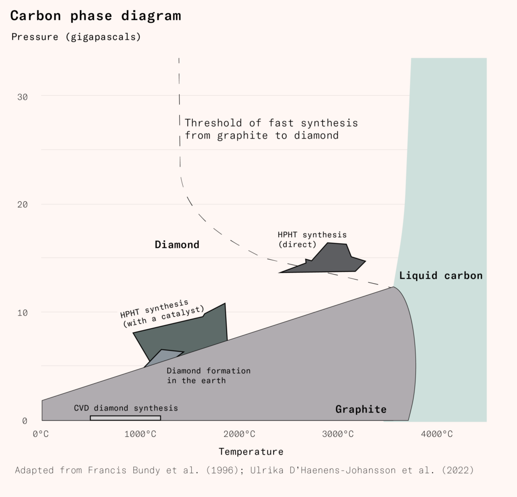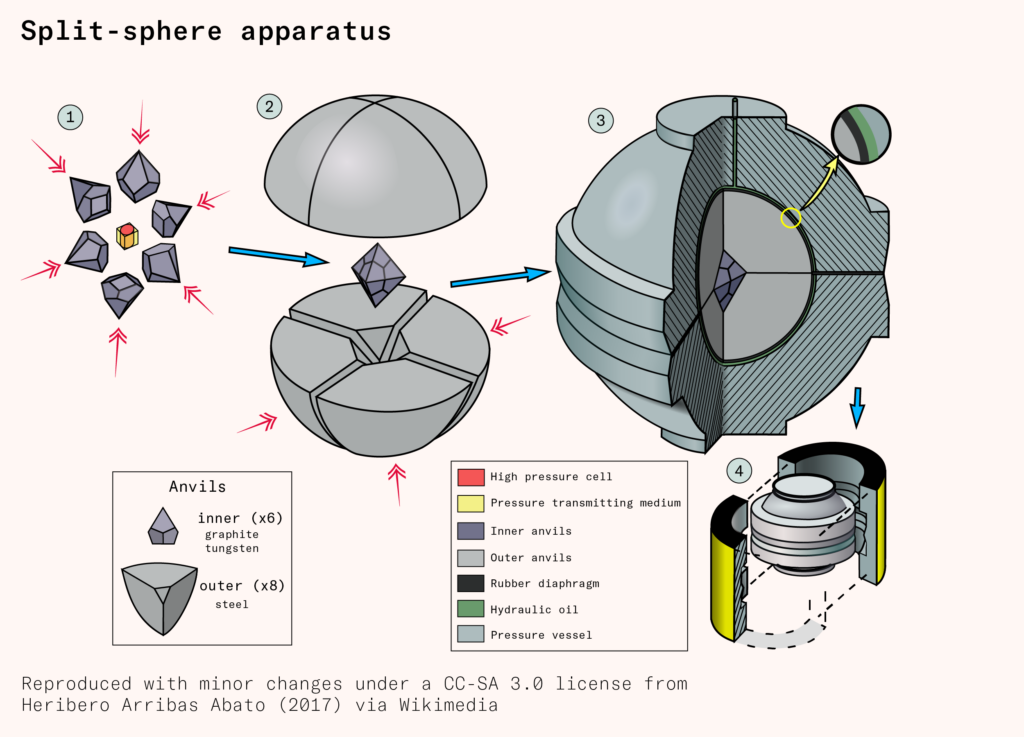 Though the belt press, the cubic press, and the split-sphere apparatus have different pressure-delivery mechanisms, the chemical reaction that occurs in the high-pressure cell is the same: graphite is converted into diamond under high pressure and high temperature, catalyzed by a metal solvent and a small diamond ‘seed’ on which the new diamond precipitates.