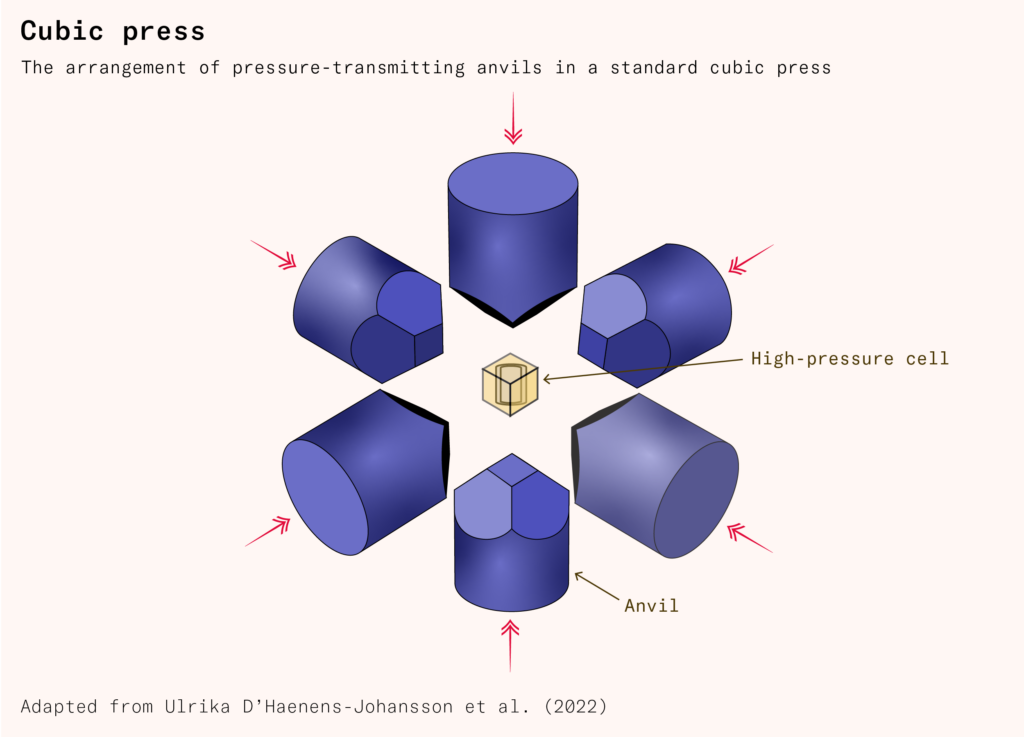 The tetrahedral press was an improvement on the belt press, but more efficient still was the cubic press, which Hall, like other industrialists making diamonds around the same time, would find more practical. A cubic press uses six hydraulically powered anvils to put pressure on the six faces of a cubic reaction cell from each side. Compared to a tetrahedron, a cube has a smaller surface area to volume ratio. Because pressure is force divided by area, this means that the cubic press can achieve the pressures required to grow diamonds with less force.