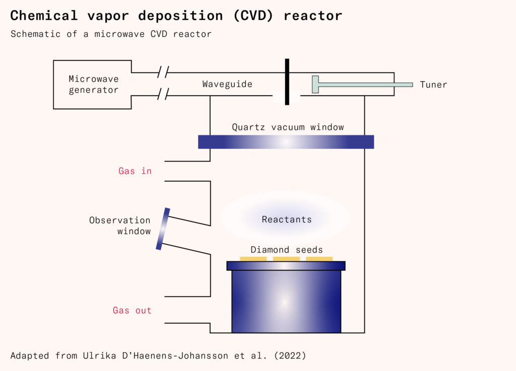 With chemical vapor deposition, a solid material is deposited from a vapor that is undergoing a chemical reaction. As a manufacturing technique, it is as old as the cavemen, who would use soot from combustion for painting. To make diamonds using this process requires heating carbon to such a high temperature that it becomes a gas of isolated atoms, and then coaxing it to crystallize into a diamond structure as it cools.