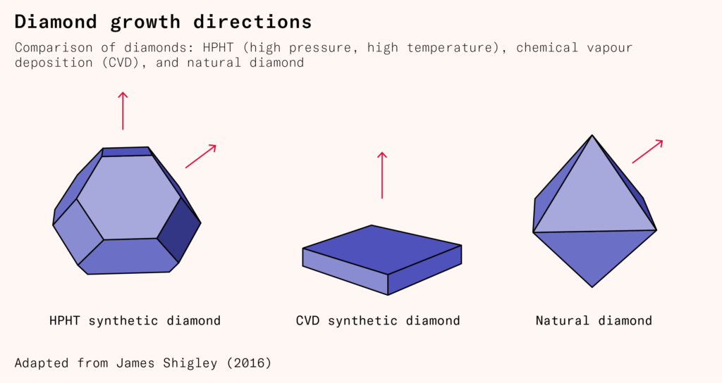 High-pressure, high-temperature diamonds are subject to roughly uniform pressure during manufacturing, leading them to grow in both the cubic and octahedral directions. Even after being cut and polished, some evidence of these growth directions remains in the form of tiny grain lines. Chemical vapor deposition diamonds, deposited layer by layer, are cubic in form. Diamonds produced in the Earth are subject to uneven pressure; most end up octahedral, though some are also cubic or irregular.
