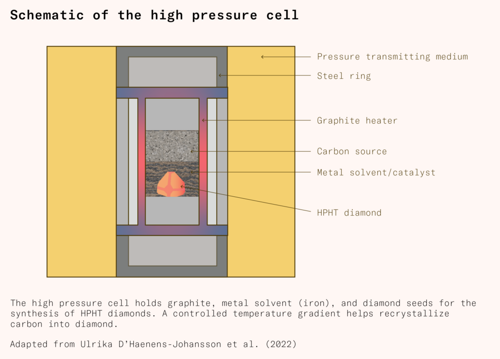 Diamond makers use metal solvent catalysts to reduce the pressure and temperature required. In the reaction cell, diamond seeds, graphite, and a transition metal solvent such as iron are heated to 1,300°C–1,800°C and five to seven gigapascals of pressure are applied. The molten metal dissolves the graphite, breaking it down into individual carbon atoms.