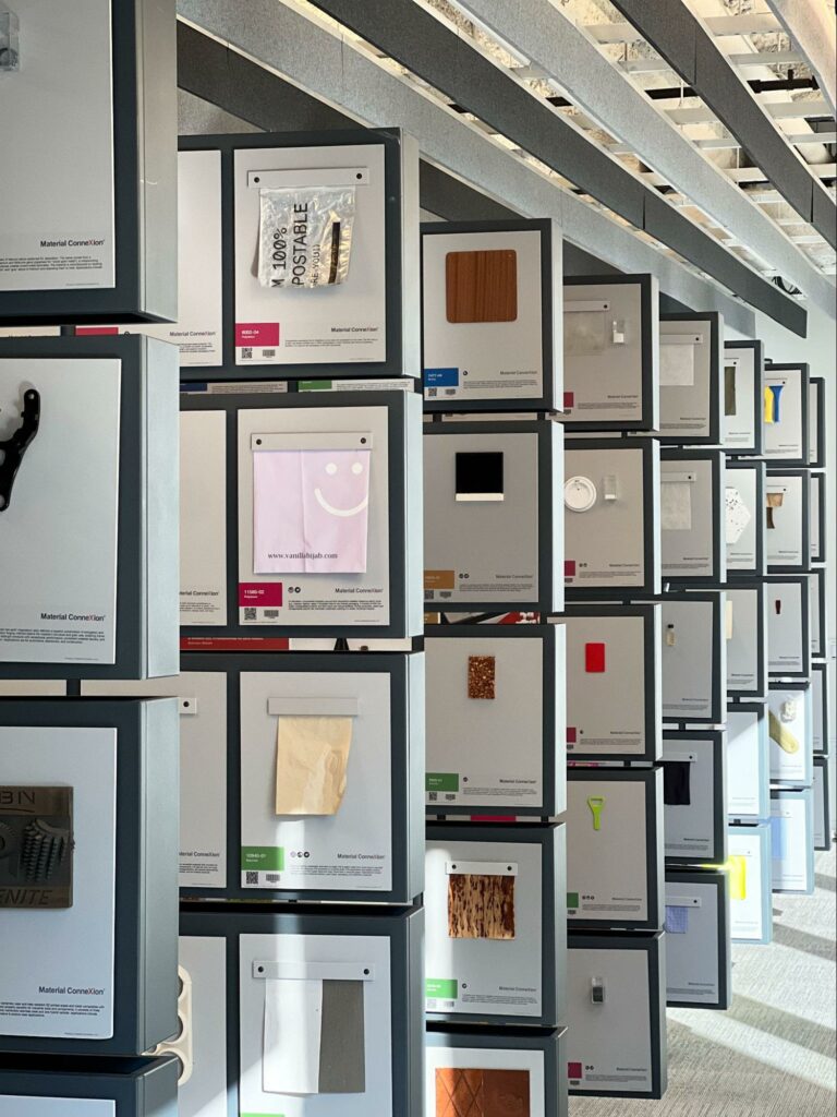 To draw people in and encourage browsing, libraries often curate thematic displays. Visitors to the Penn collection start at a color wall of diverse materials grouped by hue. Among the items in the black section are Vantablack coating, the world’s darkest substance; a swatch of sheer gray organza fabric embellished with a black mesh spiral; and a black-and-gray terrazzo-type slab made from ‘recycled portland cement, fly ash that has been saved from contaminating waterways and rare recycled marble and granite chips from quarries long since closed’.