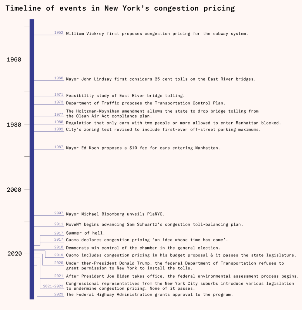 These delays in implementation are minor compared to the almost 50 years that elapsed between the first time the New York City government proposed congestion charges and when the state finally authorized them. Congestion pricing didn’t pass the New York State legislature until its fifth attempt.