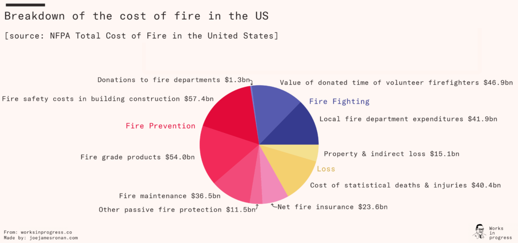 The total cost of fire today in the United States is estimated to be in the order of two percent of GDP, but that’s not because there is still a lot of fire. Actual losses due to fire constitute only 17 percent of that total, of which the vast majority is the statistical cost of death and injuries translated into dollars (in this particular estimate, the value of a statistical life is $9.6 million).