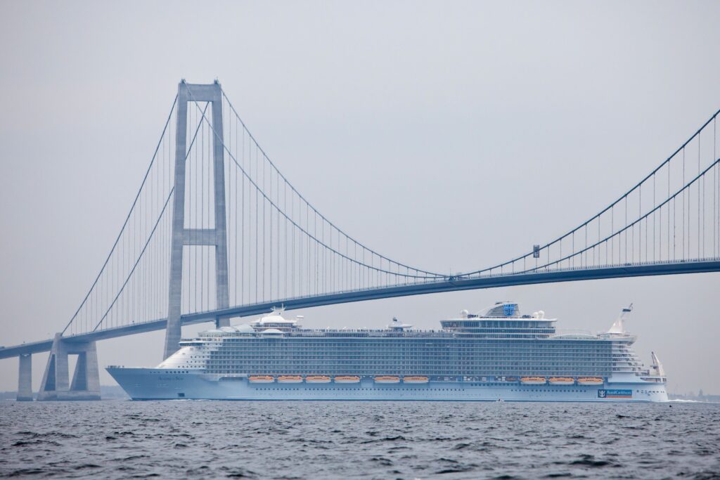 While the depth of existing ports constrains the maximum draught of cruise ships, the height of key bridges limits size in the opposite direction, placing a cap on the maximum sailing height. This was illustrated recently when Icon of the Seas could barely sail under the Great Belt Bridge in Denmark during her maiden voyage from the Turku shipyard in Finland to her final destination in Miami. The bridge has a clearance of 65 meters above sea level, requiring Icon’s engineers to partially disassemble the ship’s masts and travel at high speed during the lowest tides to safely clear it. Symphony of the Seas has retractable funnels that allow it to shrink from its usual sailing height of 72.5 meters and squeeze under the Verrazzano-Narrows Bridge (clearance 69 meters).