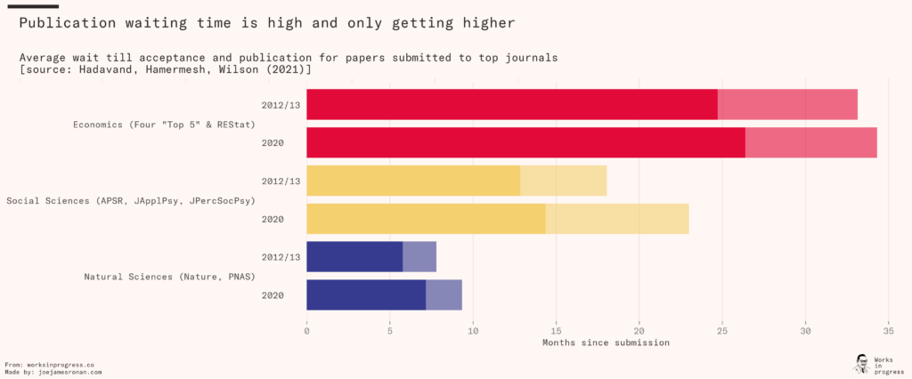 Today, a scientist who submits a study to Nature or PNAS, the Proceedings of the National Academy of Sciences, can expect to be published nine months later, on average. In the top economics journals, the process takes even longer – a staggering 34 months, or almost three years. And the length has been crawling upward each year.