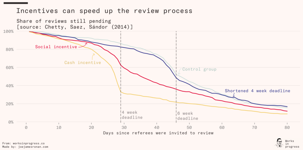 For example, in a large 2014 experiment at the Journal of Public Economics, a team led by the economist Raj Chetty tested four review processes: a control (with a six-week deadline for reviewers to submit their review), a ‘nudge’ of a shortened deadline (four weeks), a $100 cash reward (for submitting within four weeks), and a social incentive (where the times they took to review submissions were posted publicly).