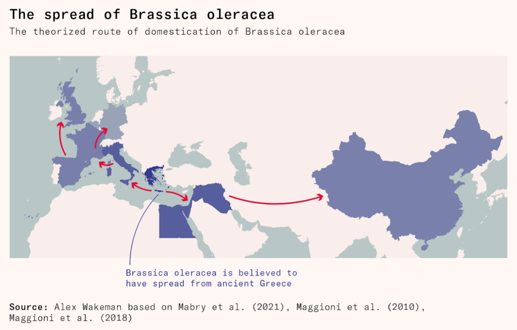 So wild cabbages were probably first domesticated into leafy vegetables in ancient Greece, before being spread to around the Mediterranean, then northern Europe and Asia (probably by the Romans). Their genetic makeup made them highly adaptable, allowing new varieties and new feral populations to emerge wherever they were introduced.