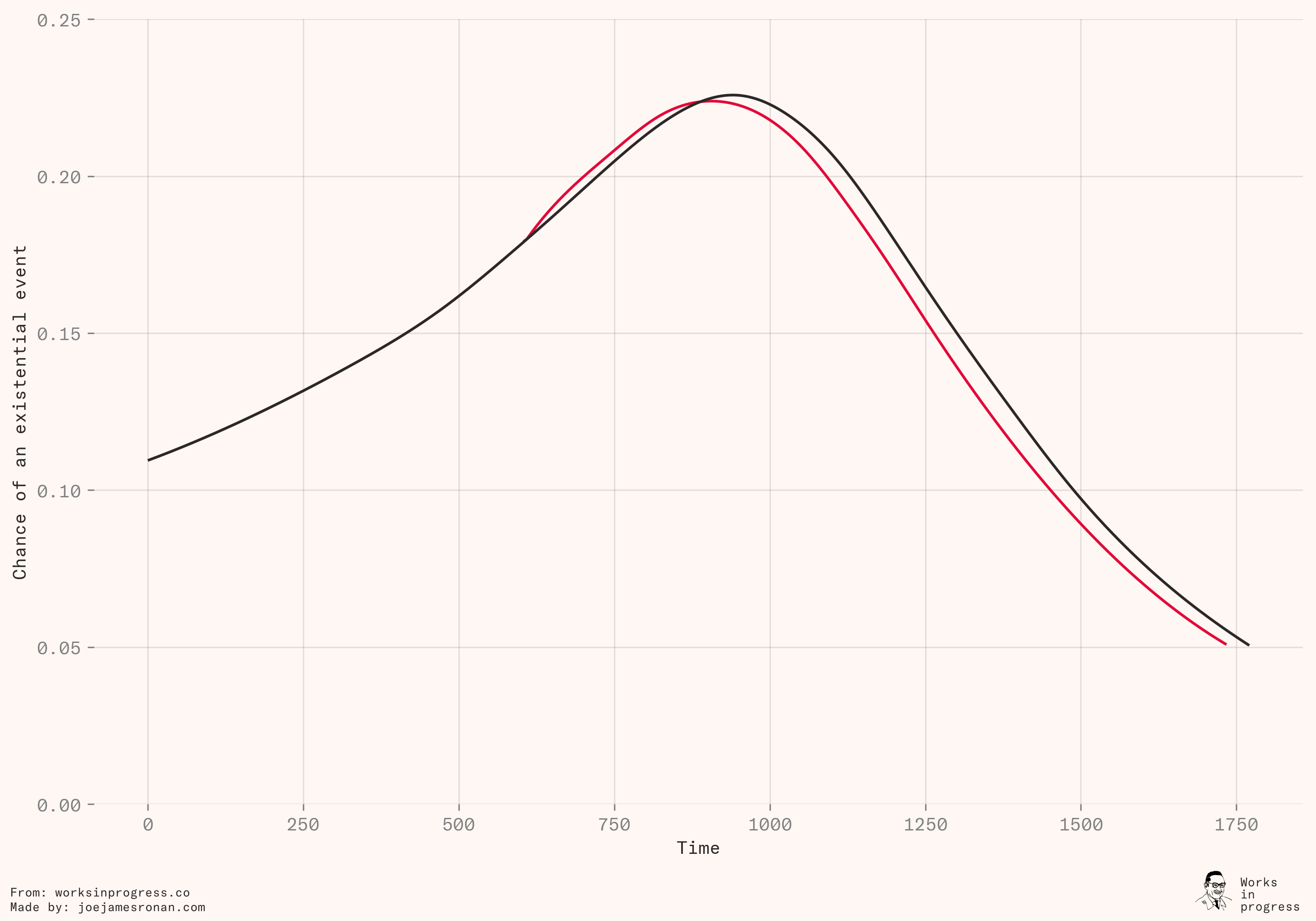 The accelerated economic growth also accelerated our path along the inverted-U shape of risk. Faster growth means people are richer sooner, so they value life more sooner, so society shifts resources to safety sooner—and ultimately we will begin the decline in risk sooner. As a result, the overall probability of an existential catastrophe—the area under the risk curve—declines!