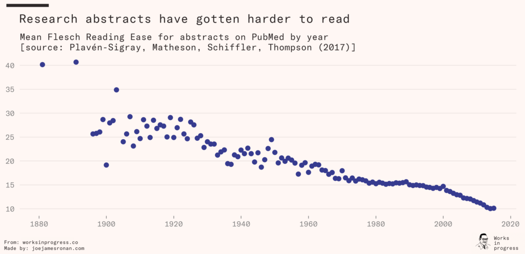There is evidence that the situation used to be better. For example, in 2017, Pontus Plavén-Sigray and colleagues analyzed hundreds of thousands of paper abstracts from 1881 to 2015, concluding that scientific writing has become steadily less readable over that period. They computed simple readability measures that aggregate the average number of words per sentence and of syllables per word – the lower, the more readable. Their results are a sign that scientific writing has been drifting away from simple, everyday language. As a related opinion piece puts it, ‘scientific texts are more impenetrable than they were over a century ago’.
