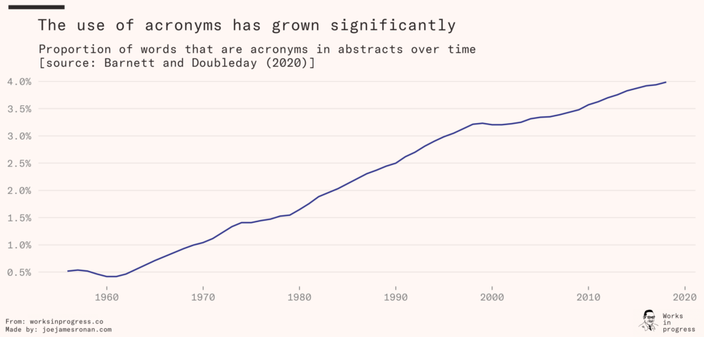 In parallel, acronyms have become more common over the past 70 years. Acronyms and abbreviations are a perennial temptation of technical writers, since they greatly help with minimizing word count and packing complicated ideas into reusable handles. But this comes at a cost, which is borne by readers. When an abbreviation is unfamiliar, readers must do some cognitive work to unpack it. This is true even if the abbreviation is defined at the beginning of the paper, as common practice demands. Humans do not read like computers: Declaring a ‘variable’ once does not guarantee that people will be able to remember it without effort when it comes up later. So, while acronyms and abbreviations do have their uses, their increased frequency over time is rather bad news.
