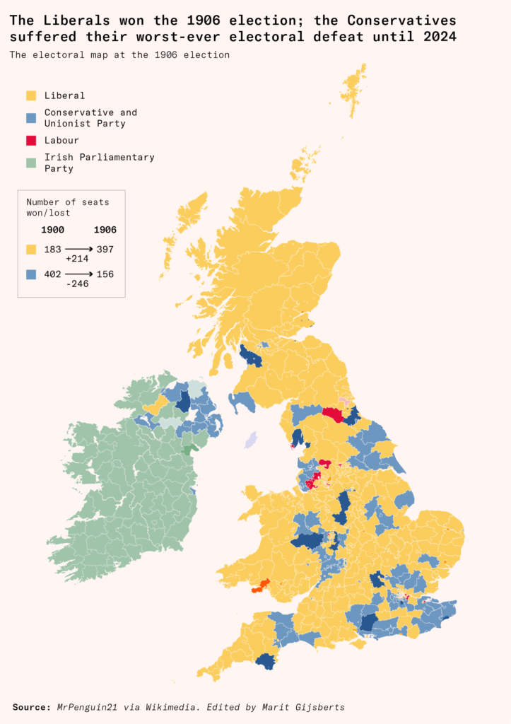 In 1903, the Conservative government of Arthur Balfour imploded over its handling of the Boer War, including public revulsion at its use of concentration camps, and colonial secretary Joseph Chamberlain’s resignation to begin a campaign of tariff reform. Chamberlain had demanded that Balfour impose tariffs on goods imported from outside the British Empire to shield industry from growing foreign competition. When Balfour refused, the resulting split fatally weakened the Conservative Party.