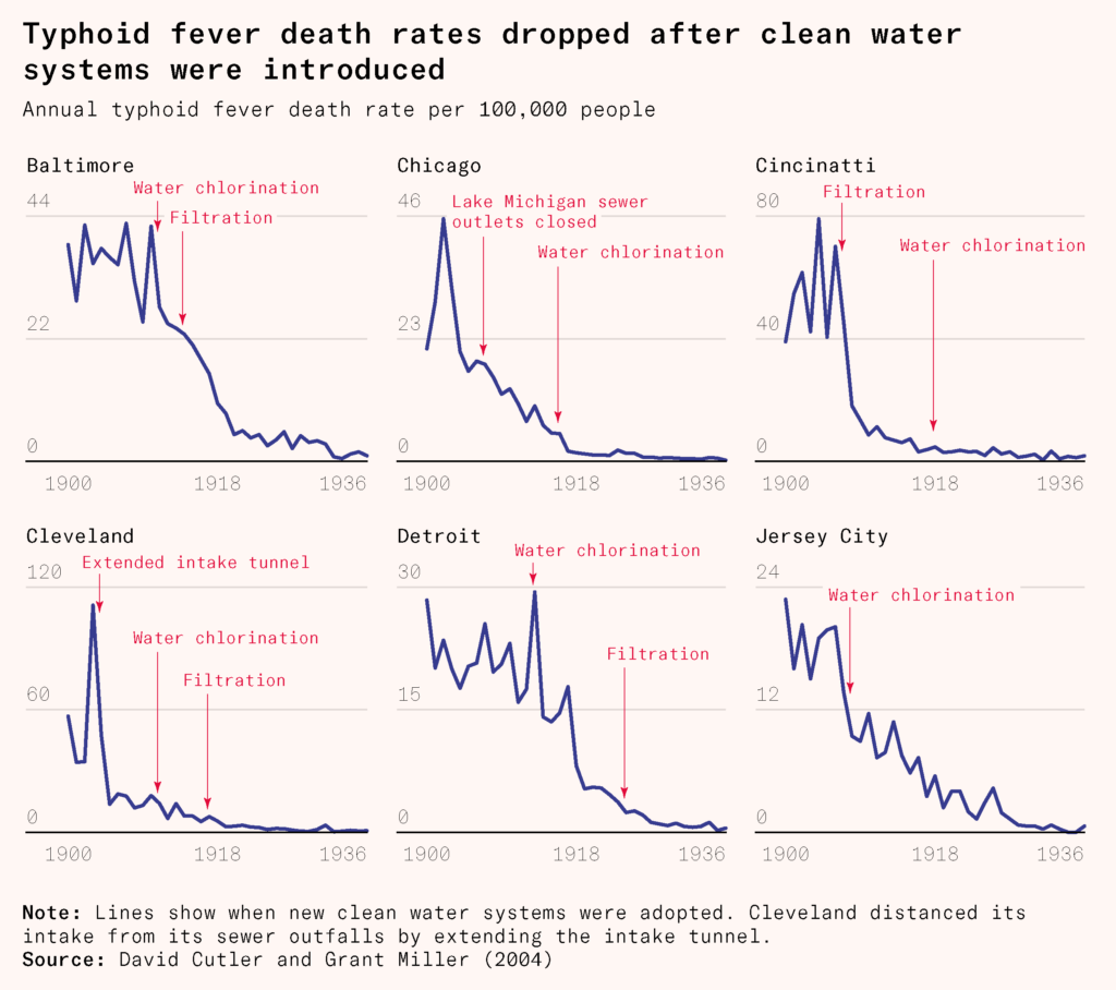 By the 1940s, infant mortality had collapsed, long before the massive scaleup of penicillin production during the Second World War. Researchers tried to tease out the different mortality rate impacts of introducing new water technologies, such as filtration and chlorination, by looking at how mortality rates dropped in different cities in the late nineteenth and early twentieth centuries. Different technologies were installed in different cities at different times, but waterborne disease mortality dropped in almost every city very soon after water treatment was installed. The researchers concluded that half the overall mortality, two thirds of the child mortality, and three quarters of the infant mortality reduction in the early twentieth century were down to clean water.