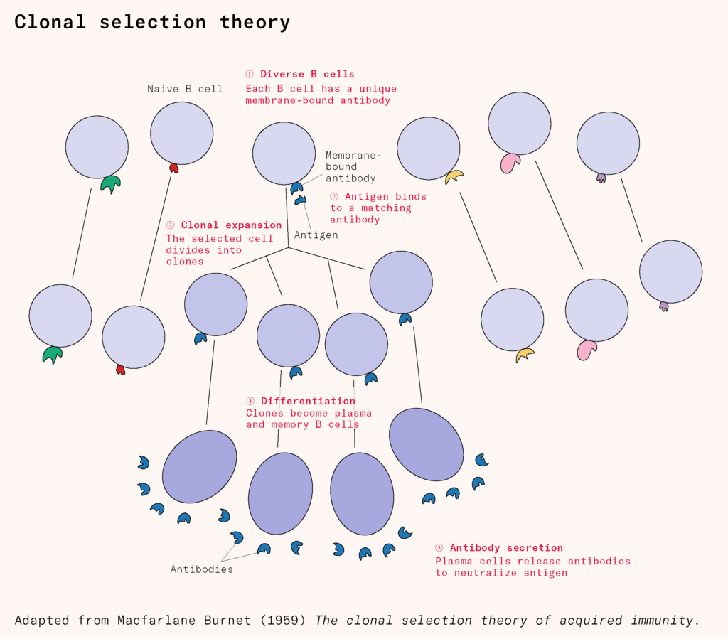One theory, the ‘instructional’ model, was proposed by Linus Pauling. He suggested that the microbe acted as a template, molding the shape of the nascent antibody to fit it. This seemed to explain the high specificity of the interactions at first. But with more data, the model broke down. Just a single unit of an antigen could generate millions or even billions of antibodies that were exact copies of one another, not what you’d expect if they all required contact. And some were present even before exposure to an antigen, like the natural antibodies people have against other blood groups.
