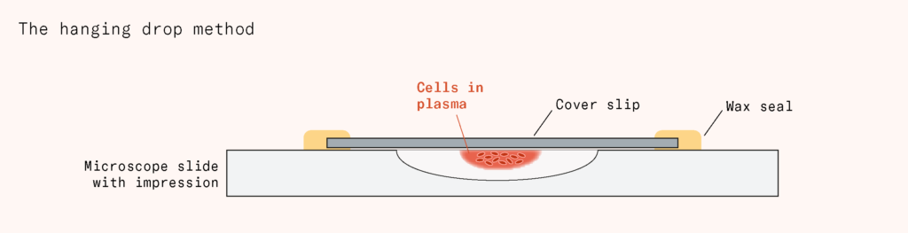 The next step forward came from neuroscientist Ross Harrison in 1907, who developed the hanging drop method. He took a piece of spinal cord from a frog embryo and put it in a drop of its plasma, placed it on a thin glass coverslip, inverted it over a concave slide, and sealed it with wax – creating a drop that hung suspended and stayed moist and rounded while the plasma provided nutrients and structure. The nerve fibers stayed alive, growing for weeks.