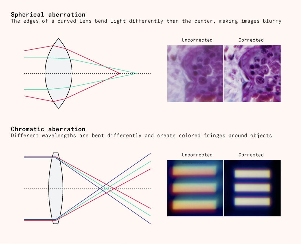 Various innovations were needed to make microscopes more precise. One step came in 1830 from the wine merchant JJ Lister, who studied lens making as a hobby. By varying the distance between lenses, he worked out how to develop achromatic and aplanatic lenses, which reduced color and spherical aberrations, respectively.