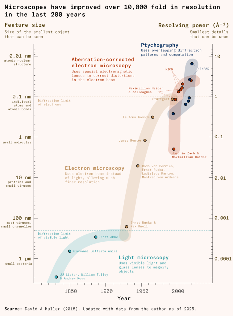 Fortunately, microscopes had been undergoing a revolution of their own. Over two hundred years, their resolution would improve more than ten thousandfold, allowing scientists to examine not only cells, but bacteria, then viruses, their protein structure, and, eventually, the individual atoms that comprised them.