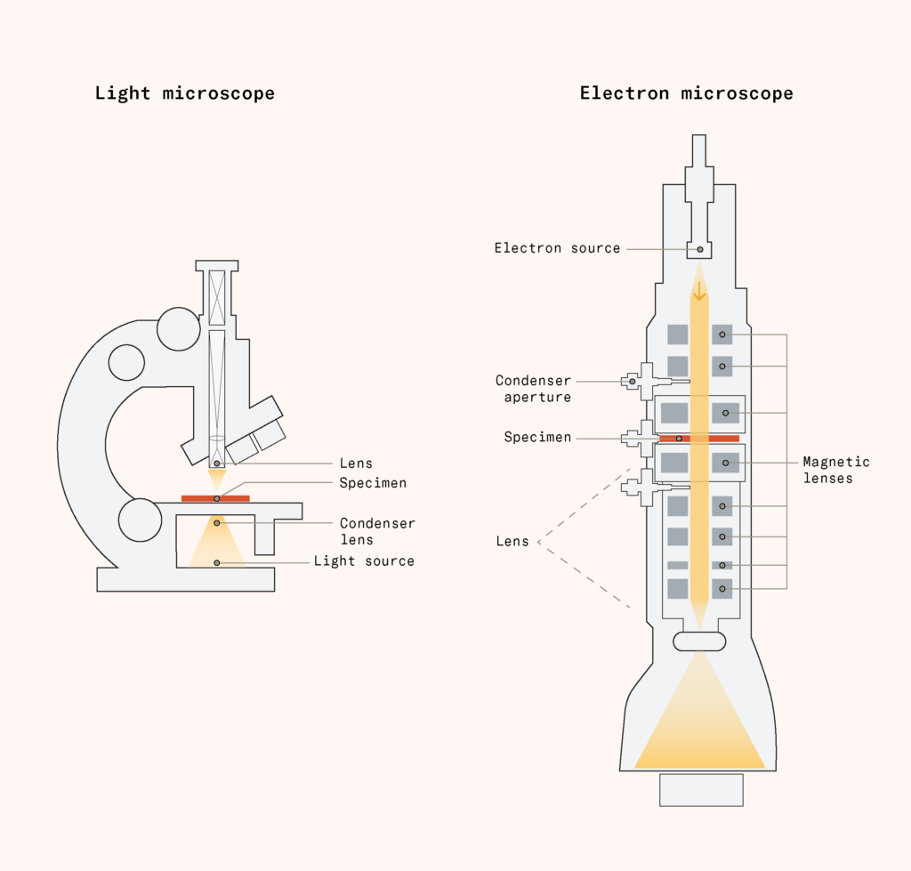 Electron microscopy combined them all. Electrons can’t be bent by glass the way light can, so electron microscopes instead use magnetic lenses: coils of wire carrying current that bend and focus the electron beam. To keep the electrons from scattering off, the instrument operates in a vacuum. The pieces work in stages: a source produces the electron beam; a condenser aperture shapes it; magnetic lenses focus it progressively onto a specimen; and more lenses project and magnify the image onto a detector.