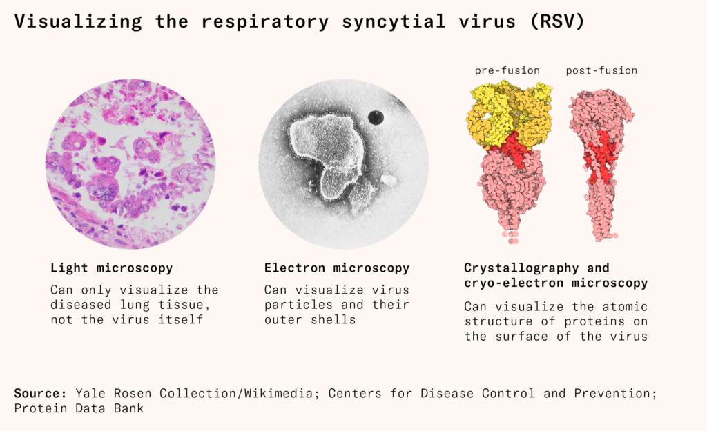 Take respiratory syncytial virus, or RSV. In the last decade, visualizing the atomic structure of its proteins helped finally develop safe and effective vaccines, decades after previous efforts failed. The critical site was a protein on its surface, the fusion protein, which helps the virus enter cells. The protein changes shape after it enters cells, by which point it’s too late: even if our immune system could recognize it, it wouldn’t matter. But its pre-fusion shape, before it enters, is a powerful target. After scientists could see its structure with crystallography and cryo-electron microscopy, they used genetic engineering to mutate the protein and lock it in its pre-fusion shape for a vaccine.