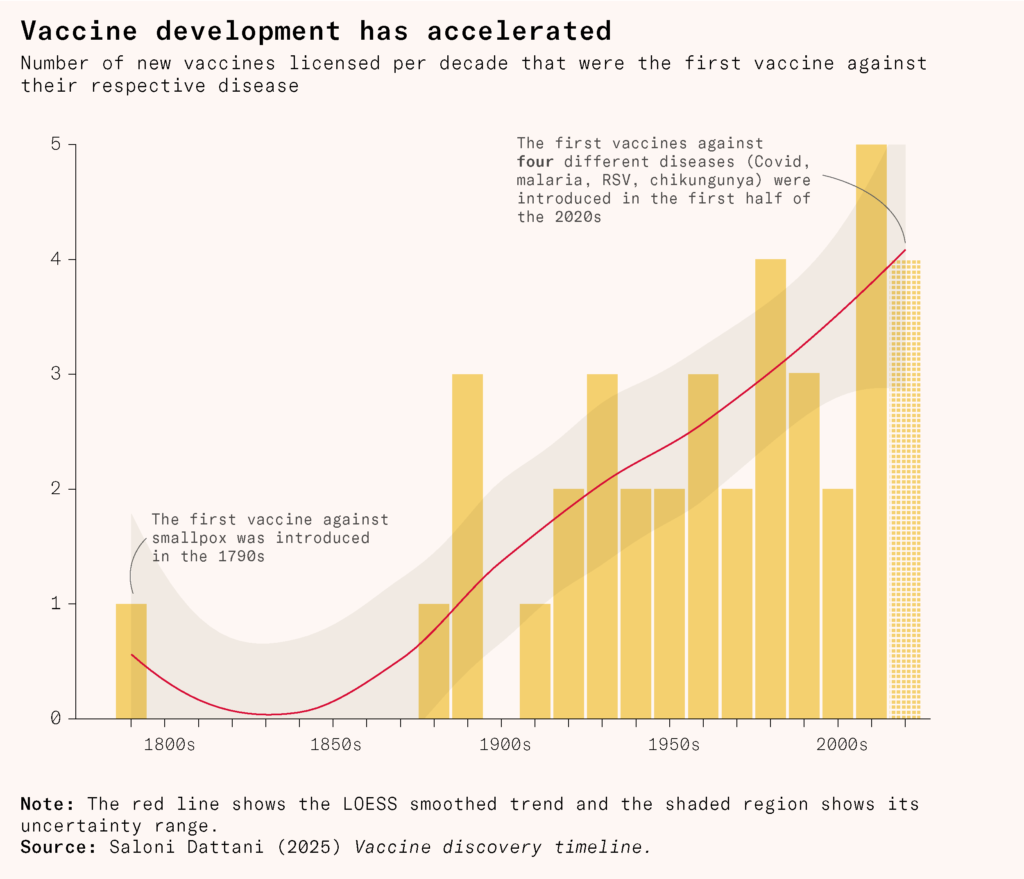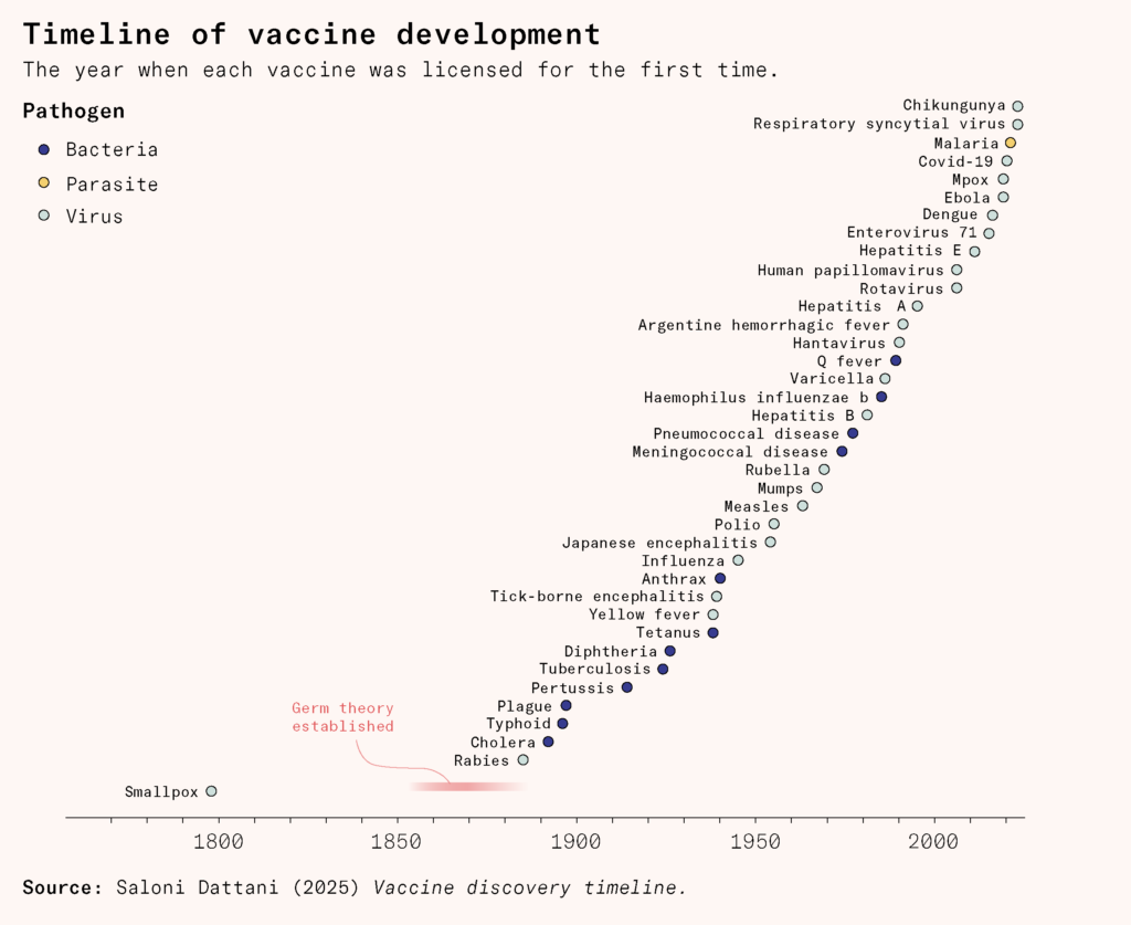 It has become far easier and faster to develop new vaccines. Microbes that were once invisible to us can now be observed at an atomic level. Vaccines were once cultured in animals, then tissues, then cells, and now their individual proteins can be built in microbial factories. They can be engineered to be safer and more precise than ever before.