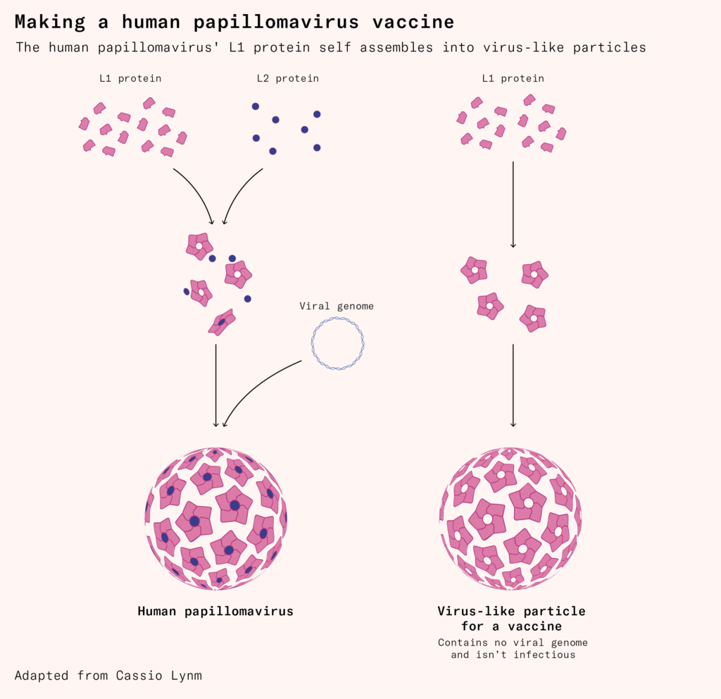 It also helped develop the first human papillomavirus (HPV) vaccine, which contains copies of a protein from the outer shell of the virus. When expressed in yeast or insect cells, these proteins spontaneously assemble into hollow ‘virus-like particles’ that resemble the real virus but contain nothing inside. The immune system responds as though they are genuine viral invaders, giving it the ability to respond swiftly if it encounters the real virus later on.