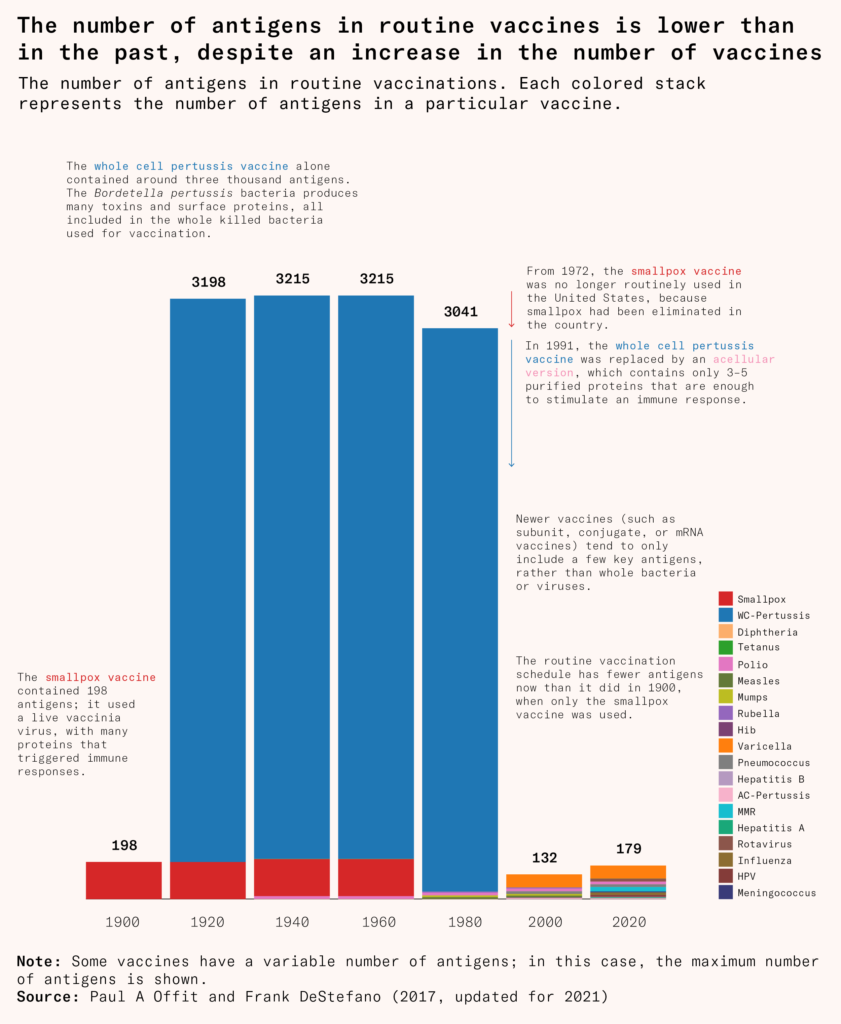 More and more vaccines have been developed with this approach, as scientists have sifted through pathogens to find only key antigens that are needed for a subunit vaccine. As they’ve replaced older vaccines, the number of antigens that children receive in childhood vaccines has fallen sharply. Children receive more vaccines today, but fewer and more targeted antigens than they did back in 1900, when only the smallpox vaccine was widely available.