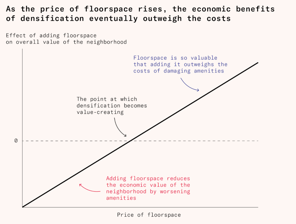 The answer lies in how the housing market has changed since the nineteenth century. Over the last century, in large part because of the Downzoning, housing shortages have emerged in many major cities, in the sense that floorspace there sells for much more than it costs to build. This means that the development rights lost through density controls have become steadily more valuable. At a certain point, their summed value became greater than that of the neighborhood values for which they had been sacrificed. It was at this point that they became value-destroying.