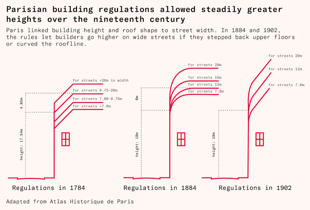 In 1890, most continental European cities allowed between five and ten storeys to be built anywhere. In the British Empire and the United States, the authorities generally imposed no height limits at all. Detailed fire safety rules had existed for centuries, but development control systems were otherwise highly permissive.
