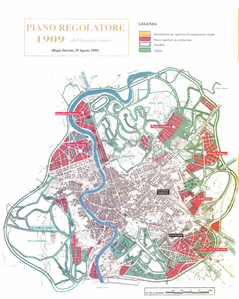 The classic illustration of this is Rome. Like most Mediterranean cities, Rome had not really developed planned low-density suburbs in the nineteenth century, but Italian planners shared the contemporary belief that public policy should promote lower densities. In 1907, a coalition of liberals and socialists won the municipal elections under the leadership of Ernesto Nathan, breaking the longstanding hold of the landowning interests over the city’s government. The coalition prepared a zoning plan that aimed at making Rome’s urban extensions into international models of good practice, by the standards of the day.