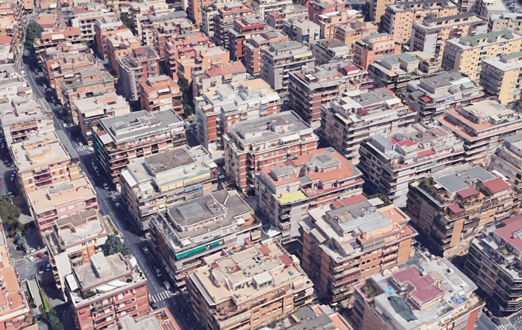 The 1909 zoning plan for Rome was radical. The red-shaded areas still allowed traditional courtyard blocks, but at lower densities than before. The green-shaded areas allowed only ‘villini’, small detached apartment buildings of no more than three storeys, covering a maximum of half of their block area. The huge areas with green outline and white infill are marked for ‘giardini’, literally ‘gardens’. Only 1/20th of the plot area in giardini areas could be built over, a density that would count as low even by modern American standards.