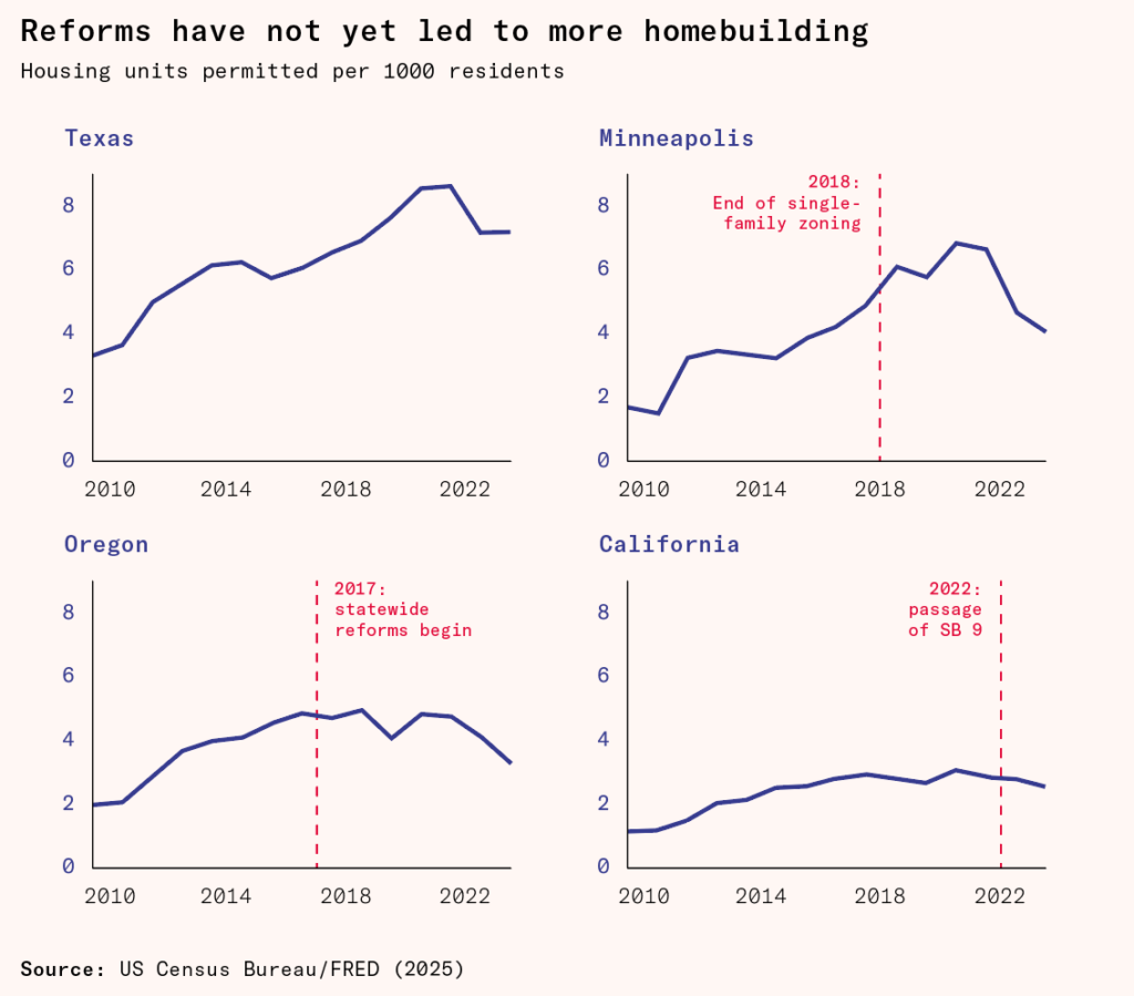 These examples are only a sample of notable cases. A series of ambitious reforms in Oregon since 2017 appears to have had no impact so far on overall housing production, as is also true following the 2018 elimination of single-family zoning in Minneapolis, Minnesota. Across the US, land use reforms have faced homeowner lawsuits and court injunctions. In Australia, New South Wales Premier Chris Minns swiftly backtracked from a ‘sweeping’ 2024 plan for transit-oriented development in response to opposition from localities and the Australian Greens party. In the United Kingdom, Boris Johnson’s government backed down from a ‘radical’ 2020 proposal to, among other things, establish a presumption in favor of development in defined areas across the country. The backlash was so intense that land use rules ended up stricter than before.