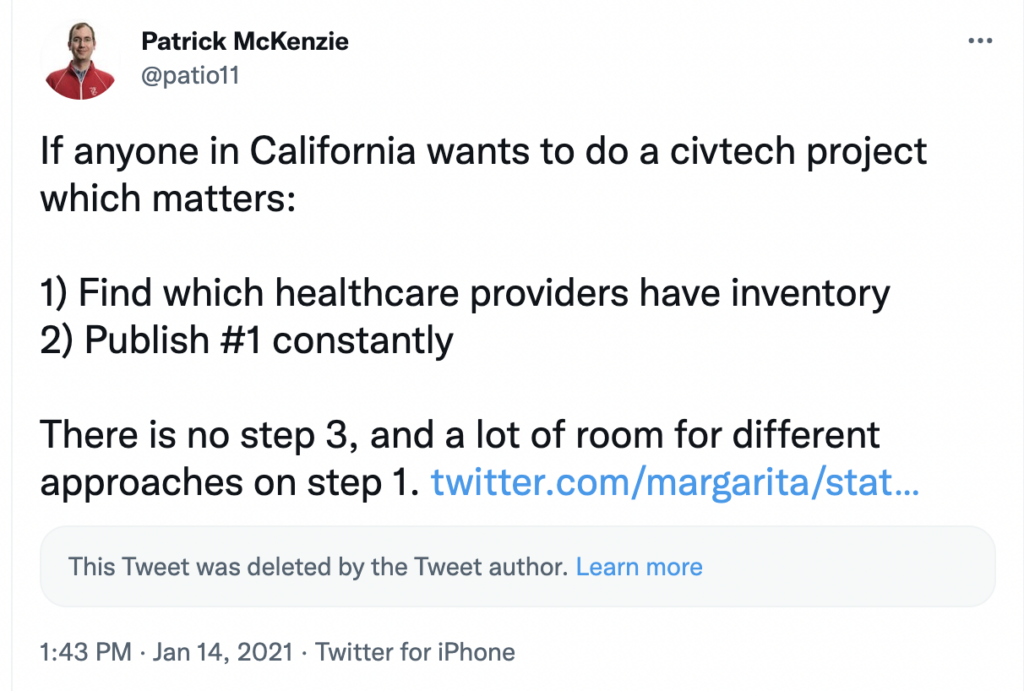Patients then asked the federal government, states, counties, healthcare providers and community groups, ‘Do you have the vaccine?’ And in most cases the only answer available to the person who picked up the phone was ‘I don’t have it. I don’t know if we have it. Plausibly someone has it. Maybe you should call someone else.’ Technologists will see the analogy to a distributed denial of service incident, and as if the overwhelming demand was not enough of a problem, the rerouting of calls between institutions amplified the burden on the healthcare system. Vaccine seekers were routinely making dozens of calls.