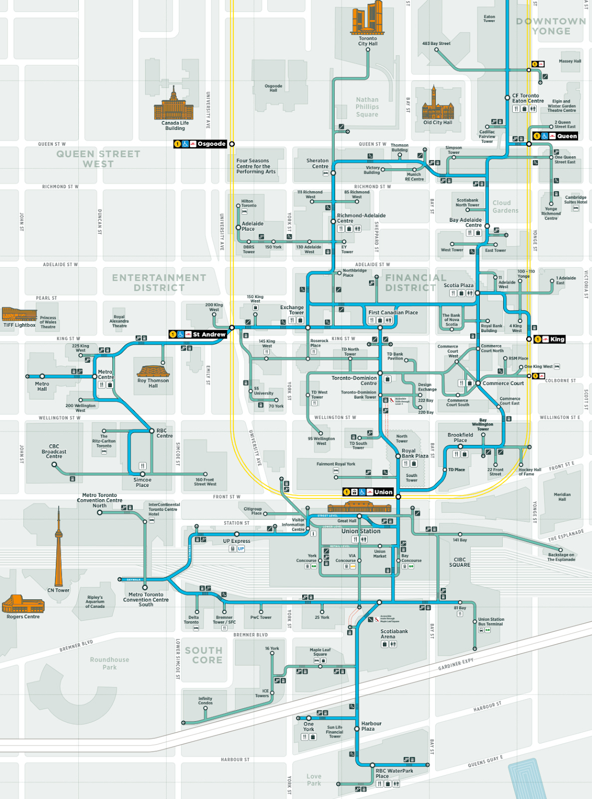 Urbanists are normally sceptical about pedestrian tunnels, fearing that they kill off street life. This is a reasonable concern and may often be a decisive reason to avoid them. But in a downtown like Toronto’s, human density is so enormous that this worry seems exaggerated. The pavements of Toronto are still busy, even on weekends, despite hundreds of thousands of pedestrians going underground. The carriageways are still congested with vehicles. It is facile to see this as a simple trade-off between walking and driving. The Path frees up space for bicycles, buses and trams as well as cars. It complements the metro and railway system by shaving off five minutes from the station-to-office walk. The Path may well be substantially net positive for a radial system of public and active transport.
