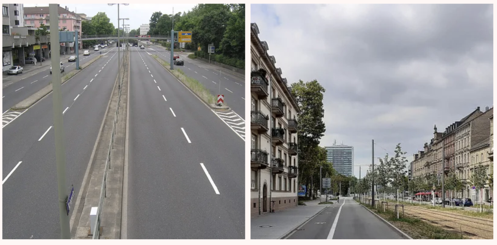 The purpose of the other tunnel was to put the city’s main east-west artery, a ten-lane road known as the Kriegsstraße, underground, and to build a boulevard on top where tram traffic can run uninterrupted by cars.