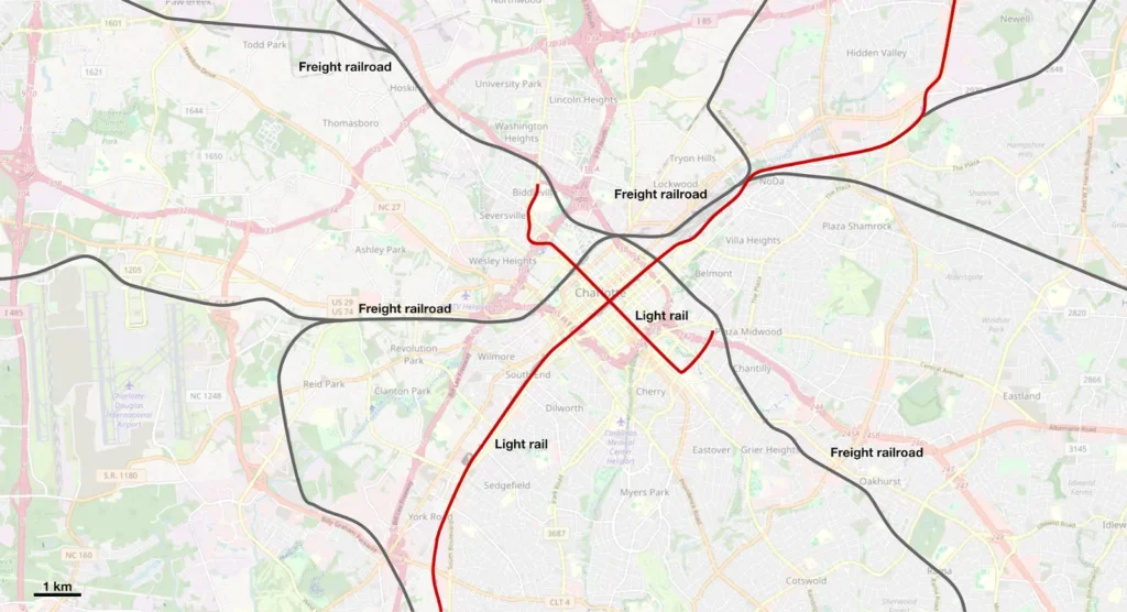 The biggest opportunity, however, is perhaps in North America. Take Charlotte, North Carolina. The American model of huge low-density suburbs means Charlotte only has 380,000 people within ten kilometers of its center, even though its urban area overall has 1.4 million people, similar to Munich’s. The low density of Charlotte means a transport network like Munich’s is not viable, but the city could take its pre-existing light rail network and join it up to the extensive network of railroad lines around the city that are currently used only for moving freight.
