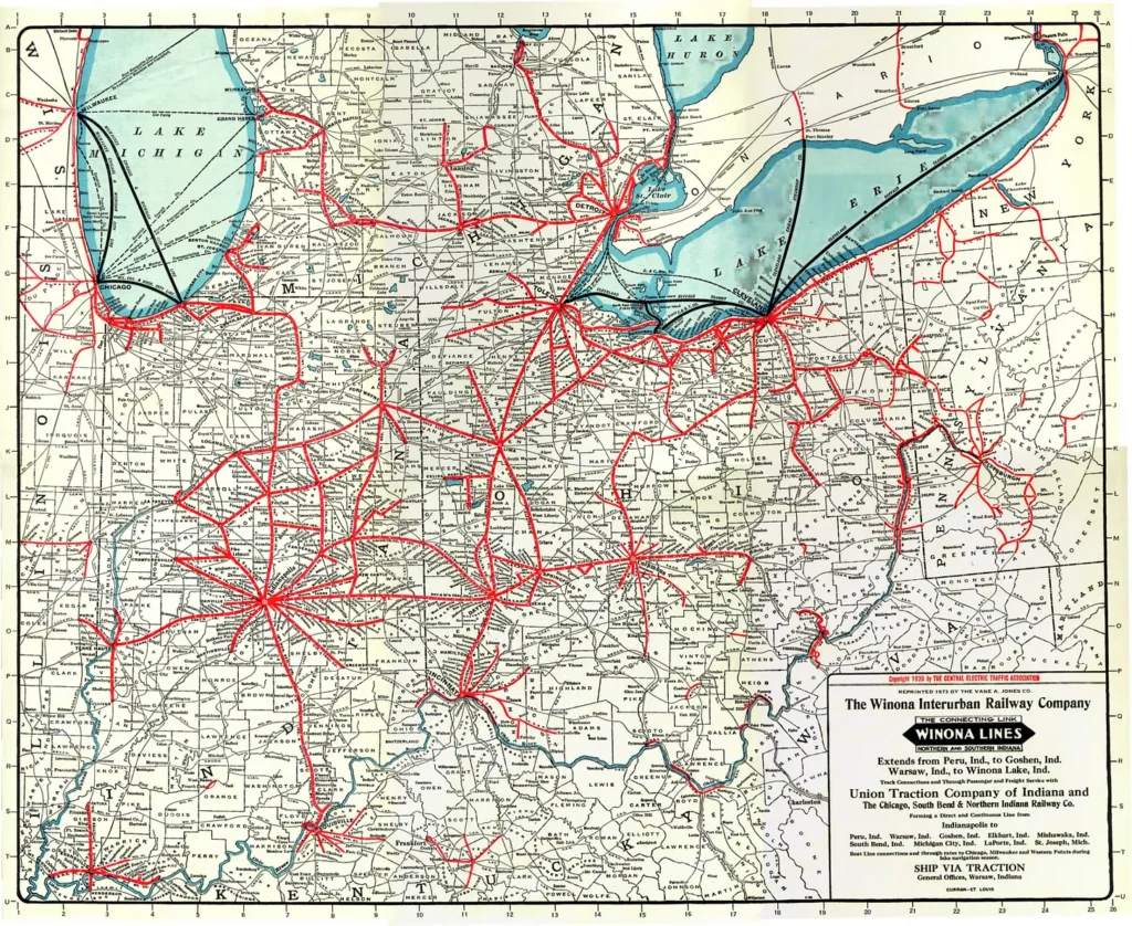 A final model of light rail worth mentioning is interurbans. Interurbans ran on streets within cities, while in suburbs and in rural areas they ran alongside roads or on dedicated rights-of-way. These systems were sometimes staggeringly expansive: at one point, it was possible to travel from Wisconsin to New York State exclusively by interurban. In the American Midwest, they were the main method of rail transport, outcompeting the commuter services offered by the American railroads. Although most of the interurban lines closed in the postwar period, a few of them are still there today: the South Shore Line still runs from Chicago to South Bend.