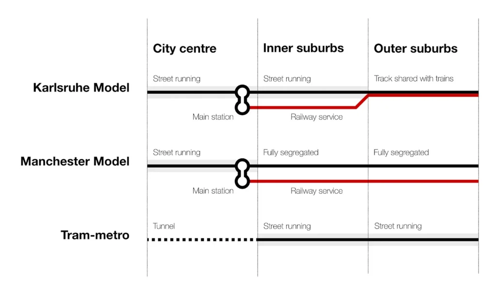 The Karlsruhe Model allows interurban-like service at much lower costs. In many cities, the suburban railway lines have already been built: they just need linking up to a tram network.