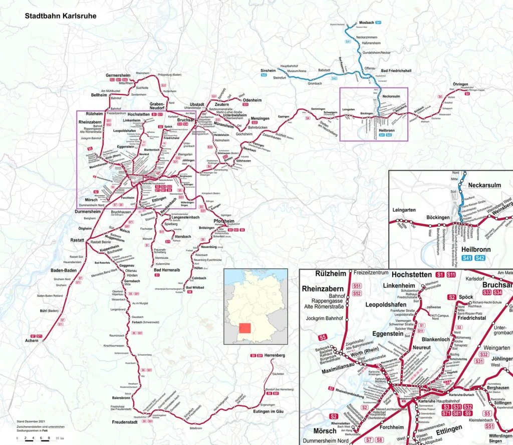 The idea of a tram that runs outside of a city’s urban area was not new: Vienna, for instance, had been operating a similar line to the neighboring spa town of Baden since 1907. Karlsruhe’s inventive step, which came later, was to extend the tram-train onto railway lines that did not just carry tram traffic. In 1979, the line was extended onto a freight railway north of the city, and in 1992 the first tram-train took over pre-existing passenger services, to the town of Bretten.