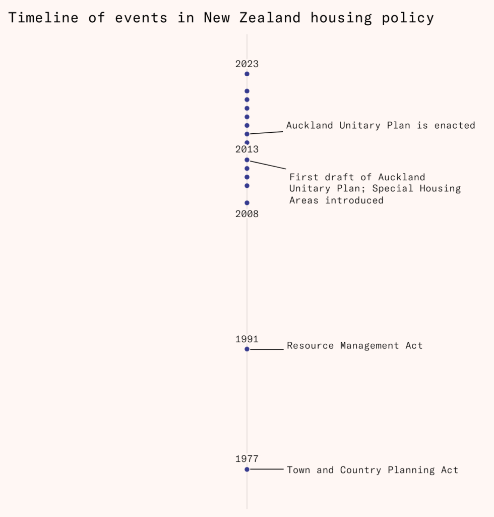 When the Town and Country Act was replaced by the Resource Management Act in 1991 – a more flexible planning system – most councils simply carried over existing development controls to their new plans, and development continued to be suppressed. Between the 1990s and the financial crisis in the late 2000s, house prices continued to climb.